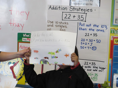 If you had read yesterday's post, you'd know that our report on the race in Ms. Murphy's classroom had just begun. The kids divided into three parties (The Fish Party, The Hermit Crab Party, and The Gecko Party). They were campaigning to choose an animal to be their class pet.